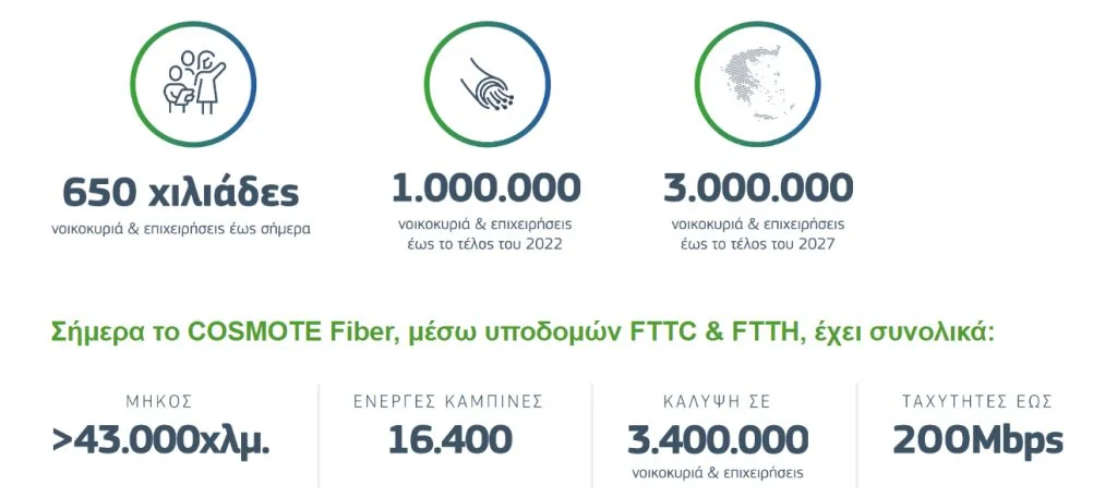Ο Όμιλος ΟΤΕ έχει ήδη ξεκινήσει την εφαρμογή ενός στρατηγικού σχεδίου για την αναβάθμιση της χώρας και ήδη πάνω από 650.000 επιχειρήσεις και νοικοκυριά σε όλη την Ελλάδα έχουν πρόσβαση σε 100% FTTH μέσω του COSMOTE Fiber, του μεγαλύτερου δικτύου οπτικών ινών στη χώρα. Επιταχύνοντας την υλοποίηση του επενδυτικού του πλάνου για την αναβάθμιση της χώρας, που ξεπερνά τα 3 δισ. ευρώ, ο Όμιλος ΟΤΕ προχωρά δυναμικά για να καλύψει περίπου τα 2/3 των γραμμών της χώρας με οπτική ίνα, φέρνοντας το FTTH σε 1 εκατομμύριο νοικοκυριά και επιχειρήσεις μέσα στο 2022, και σε 3 εκατομμύρια μέχρι το 2027. Πρόκειται για τη μεγαλύτερη επένδυση που έχει γίνει τις τελευταίες δεκαετίες στην Ελλάδα για τηλεπικοινωνιακές υποδομές, με πολλαπλά οφέλη για τους καταναλωτές, τις επιχειρήσεις και τη χώρα συνολικά.
