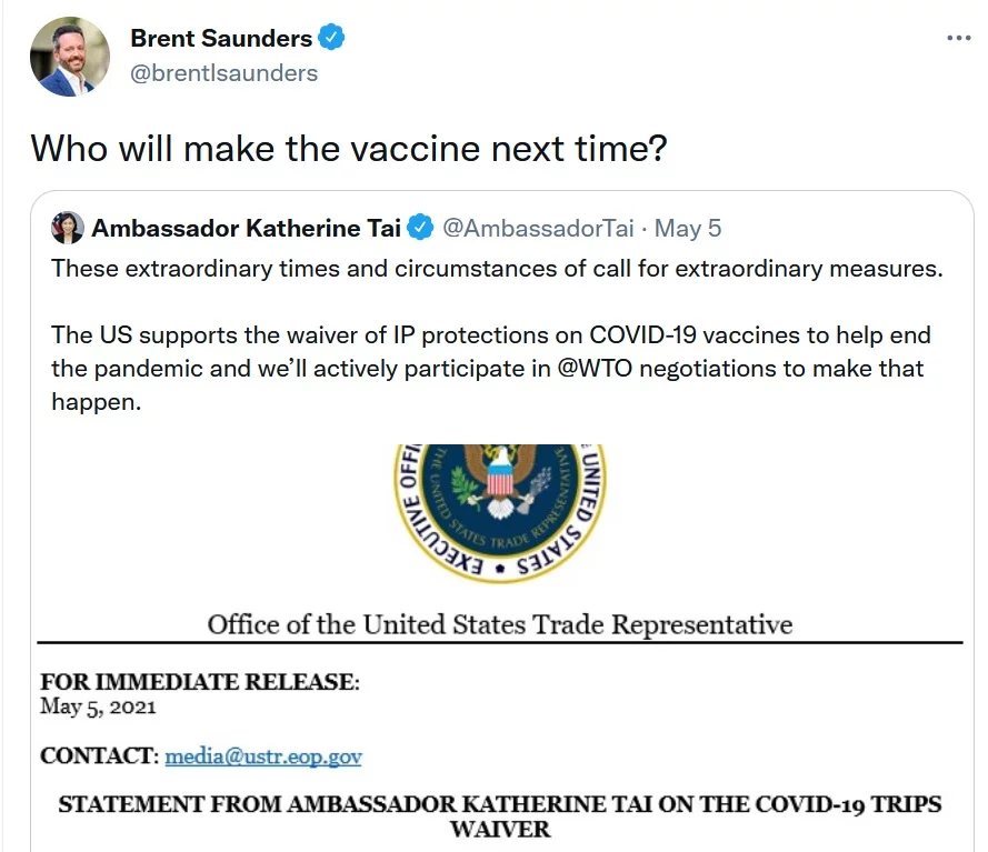 Εκτός από τις φαρμακοβιομηχανίες που παράγουν εμβόλια, την αντίθεσή τους στην πρόταση των ΗΠΑ εκφράζουν αρκετές κυβερνήσεις ανά τον κόσμο – πιθανότατα λόγω των εντατικών πιέσεων που ασκεί το φαρμακευτικό λόμπι. Στην προτεινόμενη άρση προστασίας των πνευματικών δικαιωμάτων–που σημειωτέον πρέπει να εγκριθεί από την ολομέλεια του Παγκόσμιου Οργανισμού Εμπορίου– αντιτίθετο στο πρόσφατο παρελθόν τόσο η αμερικανική κυβέρνηση, όσο και η ΕΕ, αλλά και τρίτες χώρες, όπως η Ελβετία και η Ιαπωνία.