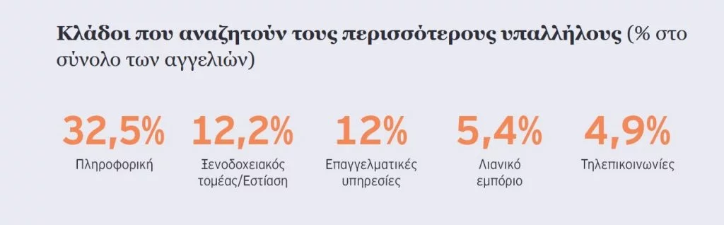 - Οι πιο περιζήτητες θέσεις εργασίας αφορούν τις τεχνολογίες πληροφορικής και της εξυπηρέτησης πελατών/πωλήσεων.