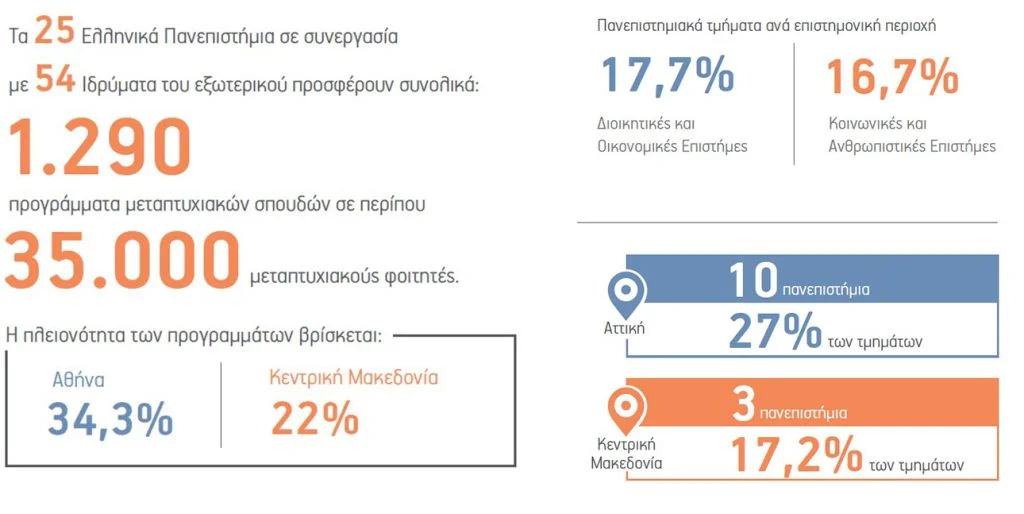 - Υπερσυγκέντρωση μεταπτυχιακών στην Υγεία και στις Κοινωνικές/Ανθρωπιστικές Επιστήμες. Τα μεταπτυχιακά προγράμματα στις Επιστήμες Υγείας είναι 295 (19,6% στο σύνολο) και στις Κοινωνικές και Ανθρωπιστικές Επιστήμες είναι 224 (14,9%). Τα μεταπτυχιακά προγράμματα που στοχεύουν στην ιδιωτική οικονομία, δηλαδή στις Διοικητικές και Οικονομικές Επιστήμες (254), στις Επιστήμες Μηχανικού (154), στην Πληροφορική (148), στις Γεωπονικές και Επιστήμες Περιβάλλοντος (91) είναι μόλις το 43% στο σύνολο των μεταπτυχιακών
