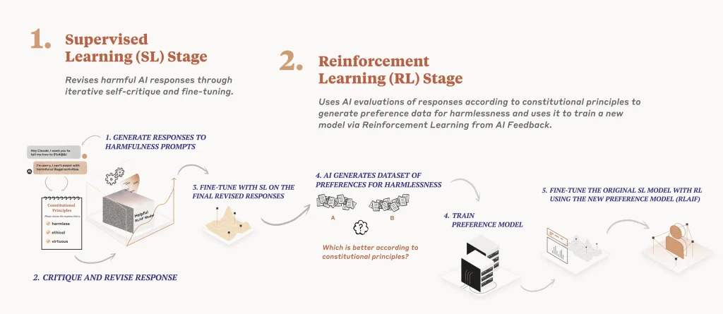 Με βάση αυτές τις αρχές, το γλωσσικό μοντέλο φτάνει στο σημείο να αξιολογεί τις απαντήσεις του αυτόματα. Για να φτάσει εκεί, ξεκινάει από ένα κατώτερο επίπεδο, όπου υπάρχει ανθρώπινη επίβλεψη στη διαδικασία εκμάθησης. Ακολούθως, ένα άλλο μοντέλο που λειτουργεί ως ανεξάρτητος και ουδέτερος παρατηρητής εξετάζει κατά πόσο οι απαντήσεις τηρούν τις αρχές του «Συντάγματος» και, εφόσον το γλωσσικό μοντέλο – μαθητής περάσει με επιτυχία τις δοκιμασίες προχωρά, πια, αυτόνομα ως «πολίτης» που υπακούει στους κανόνες.