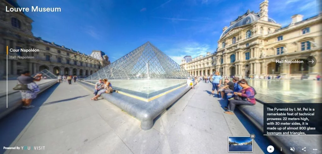 Πολλά από τα μουσεία που είχαν ήδη τις υποδομές για να επιτρέψουν εικονικές επισκέψεις, αξιοποίησαν την «ευκαιρία» για να ανοίξουν τις εικονικές αίθουσές τους σε επισκέπτες απ’ όλο τον κόσμο. Το Μουσείο του Λούβρου στο Παρίσι, για παράδειγμα, μας επιτρέπει να το επισκεφθούμε από την άνεση του σπιτιού μας και να θαυμάσουμε πολλά από τα έργα και μάλιστα με εγγύτητα που δεν θα μπορούσαμε καν να διανοηθούμε μέσα στο μουσείο. Ο επισκέπτης για παράδειγμα μπορεί να δει από απόσταση χιλιοστών τα χρώματα και τις υφές στους πίνακες, να ζουμάρει στα χαρακτηριστικά και να μελετήσει τις τεχνοτροπίες όπως δεν θα μπορούσε να κάνει ακόμη κι αν έμενε μόνος του στο μουσείο.
