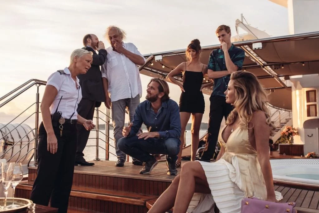 Στιγμιότυπο από την ταινία Triangle of Sadness, σουηδικής παραγωγής, γυρίσματα της οποίας έγιναν στην Παραλία Χιλιαδού της Εύβοιας αλλά και σε άλλα σημεία στην Ελλάδα.