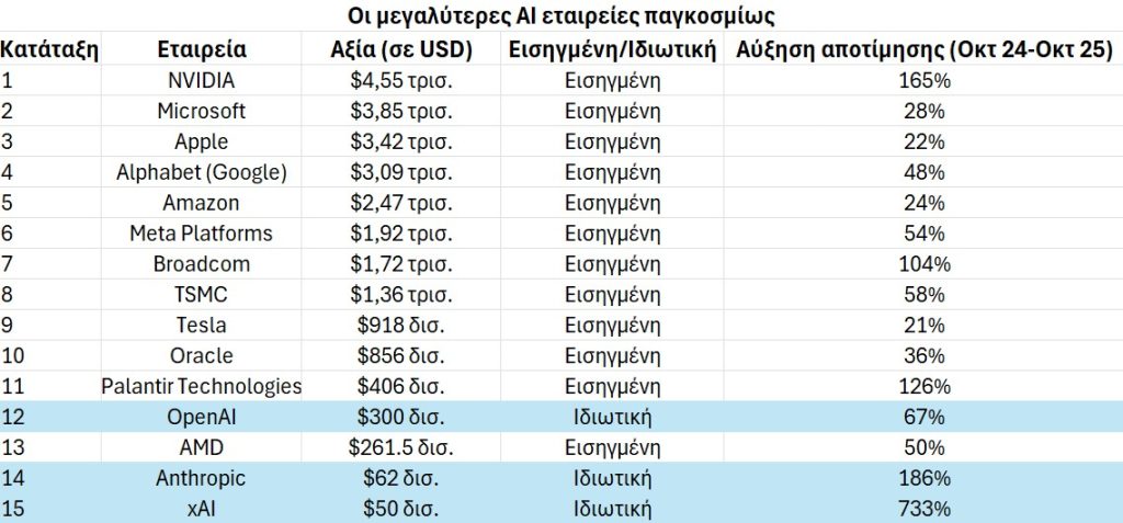 Η αποτίμηση της Nvidia έχει φτάσει αισίως τα 4,58 τρισ. δολάρια, η αξία της OpenAI υπολογίζεται αυτή τη στιγμή στα 500 δισ. δολάρια και όλες οι εταιρείες που βρίσκονται στον χώρο της τεχνητής νοημοσύνης βλέπουν τις δικές τους αποτιμήσεις να κινούνται ανοδικά. Μήπως όμως αυτή η ευφορία στις αποτιμήσεις τερματιστεί απότομα;
