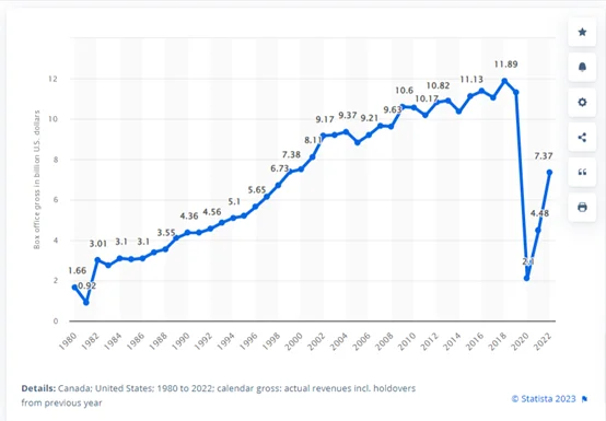 Διεθνώς επίσης η τάση ήταν ίδια. Πτώση μετά το 1999, ανακοπή της πτώσης στα πρώτα χρόνια του 21ου αιώνα και ουσιαστική ανάκαμψη μόλις από το 2016 και μετά, όταν ευρυζωνικότητα και streaming δημιούργησαν τις προϋποθέσεις για ποιοτικές και προσιτές υπηρεσίες «κατανάλωσης» μουσικής. Μιλάμε για μουσική, διότι αυτή ήταν εκείνη που επλήγη πρώτη από το τσουνάμι των δικτύων peer-to-peer και της ανταλλαγής αρχείων mp3. Η βιομηχανία του κινηματογράφου επίσης επηρεάστηκε, όμως, κρίνοντας από τα έσοδα των κινηματογραφικών αιθουσών στις ΗΠΑ και τον Καναδά, η επίδραση δεν ήταν τόσο καθοριστική και η βουτιά που καταγράφεται στο διάγραμμα που ακολουθεί οφείλεται, βεβαίως, στον κορονοϊό και όχι στην πειρατεία.