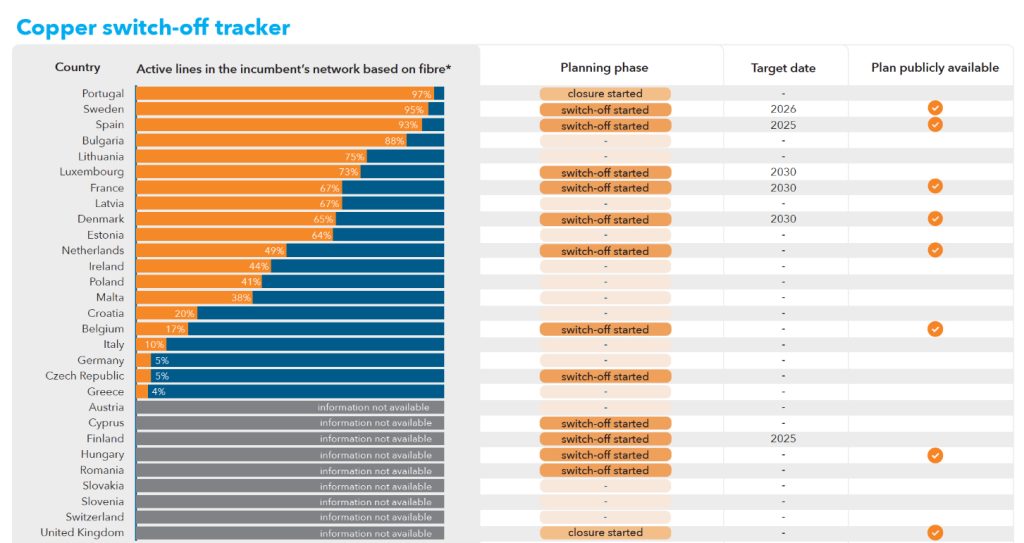 Πάντως, ανεξαρτήτως του τι θα γίνει στο… μαγειρείο των Βρυξελλών, σε κάποιες χώρες της Ε.Ε. η εποχή του τηλεπικοινωνιακού χαλκού τελειώνει. Σύμφωνα με στοιχεία του FTTH Council από τις αρχές του 2025, το προβάδισμα είχε η Πορτογαλία με σχεδόν πλήρη αντικατάσταση του χαλκού από τις οπτικές ίνες, ενώ την πρώτη πεντάδα συμπλήρωναν Σουηδία, Ισπανία, Βουλγαρία και Λιθουανία. Για τη χώρα μας, το αναφερόμενο ποσοστό αντικατάστασης ήταν το 4%.