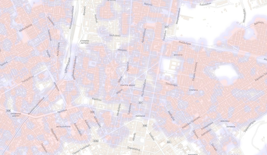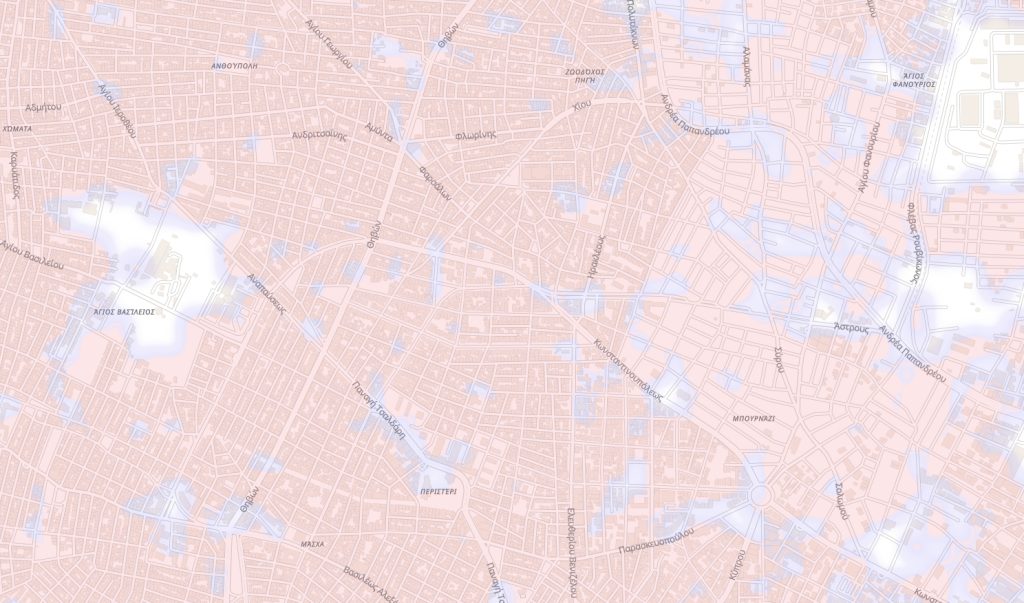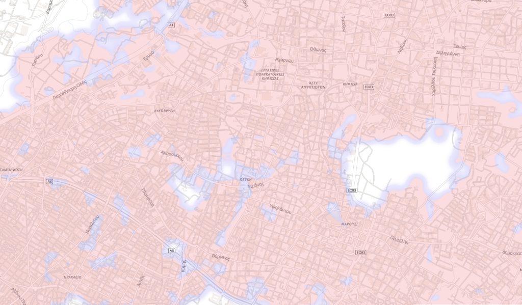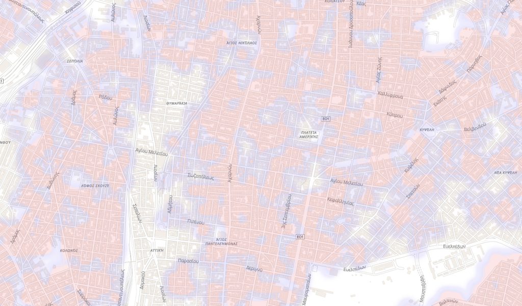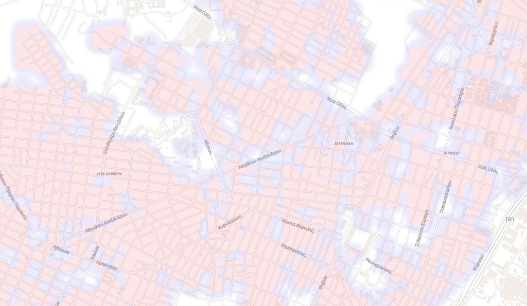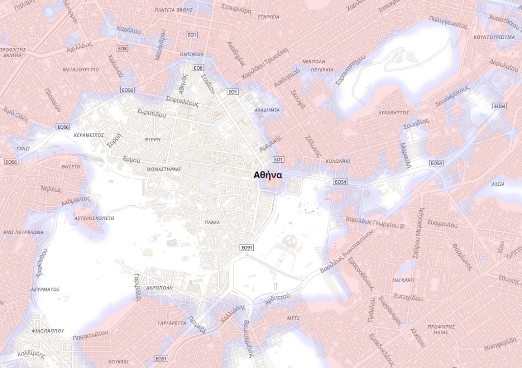 Στην ευρύτερη εικόνα της Αθήνας βλέπουμε ότι η εικόνα είναι μεικτή. Βλέπουμε πάλι μια αρκετά εκτεταταμένη «λευκή» περιοχή (άνευ κάλυψης, δηλαδή) που ξεκινάει από τον Σταθμό Λαρίσης και, κινούμενη παράλληλα της Λεωφόρου Κωνσταντινουπόλεως φτάνει ως τα Σεπόλια.
